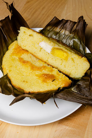 Line cake pan with banana leaves that have been cleaned and softened over low heat. Pour batter into the pan and bake for 375 F for 15 minutes.